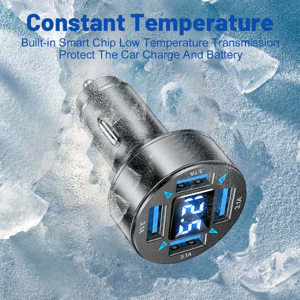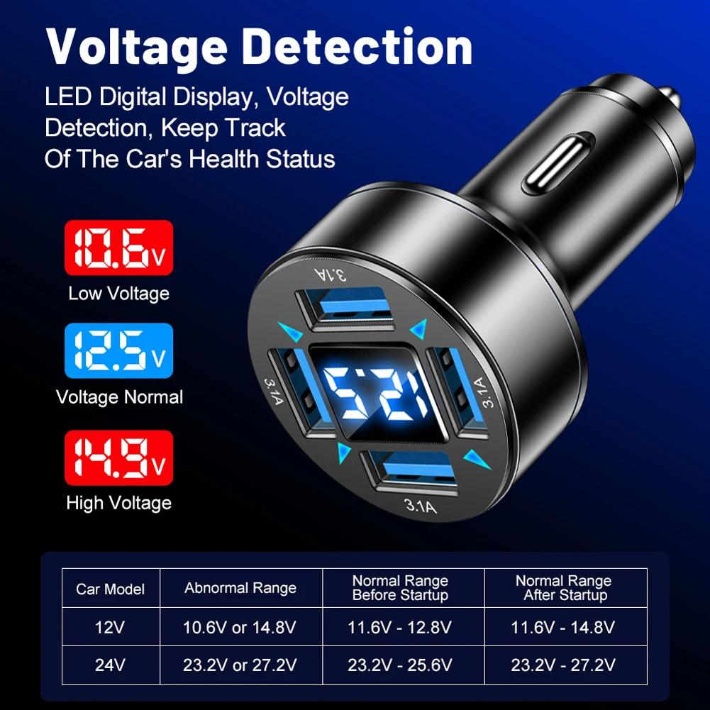 66W Power Adapter 4-Port Blue Light Fast Car Charger USB PD Quick Charge Adapter QC 3.0 LED Digital Display for iPhone Samsung