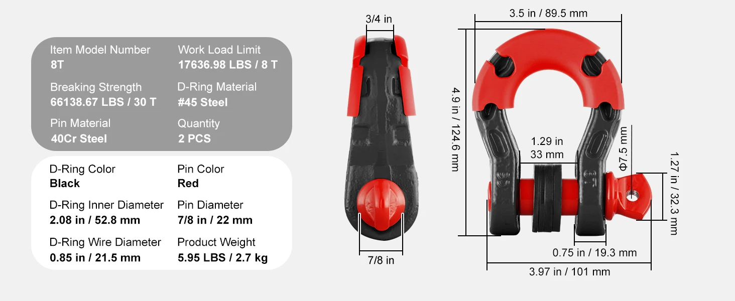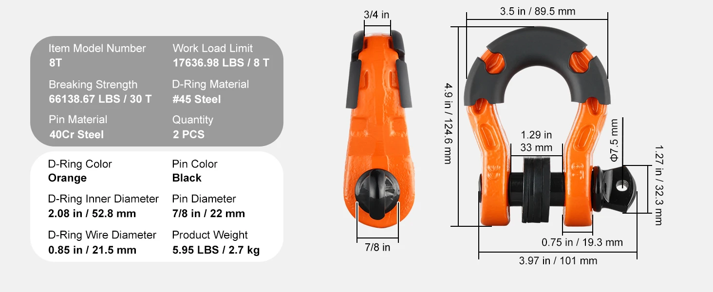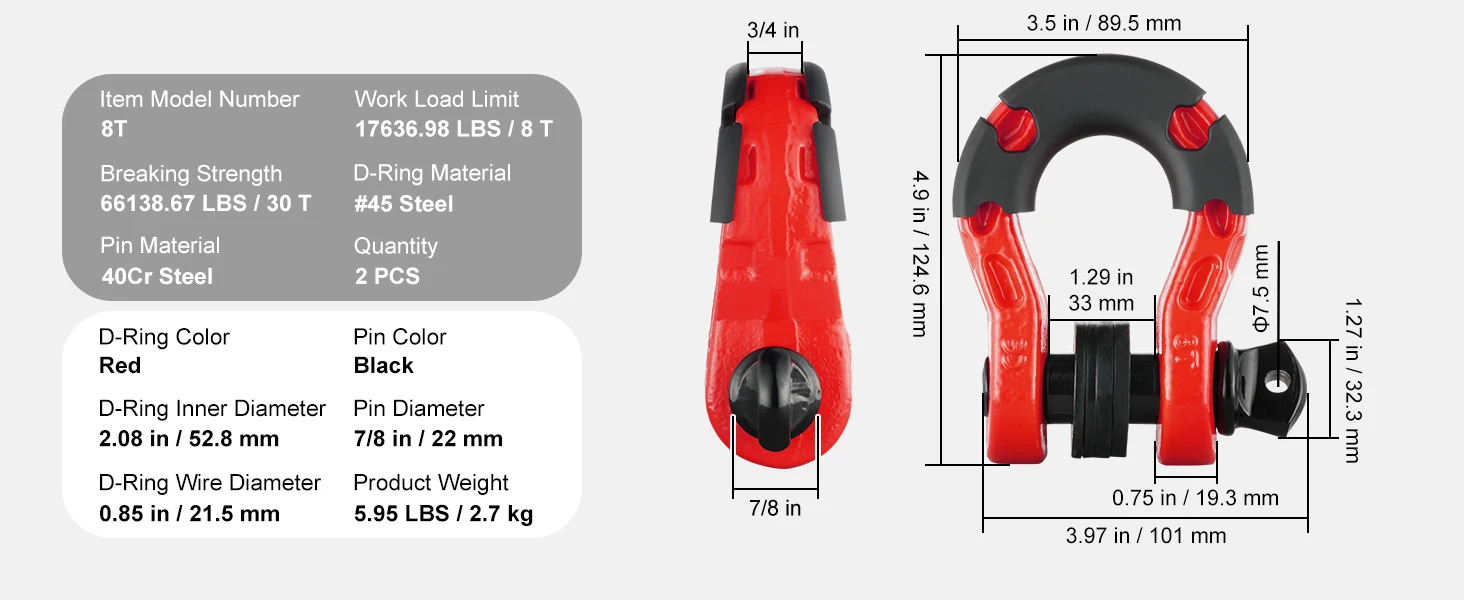 • Built for Heavy-Duty Strength: Crafted from high-grade forged 45# steel, this D-ring shackle handles towing weights up to 17636.98 lbs/8T with ease.