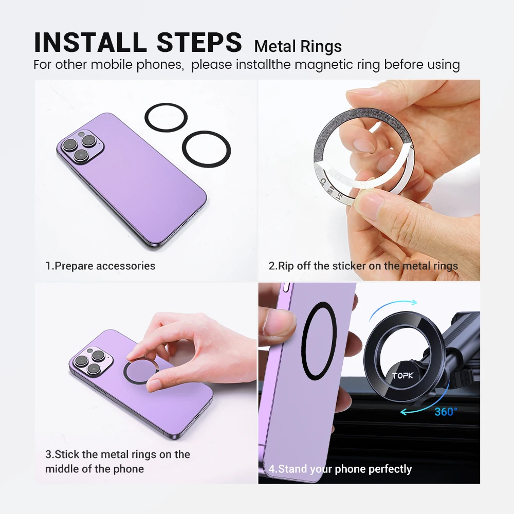 Universal for all phones, comes with an extra metal ring, this magnetic car phone holder is suitable for all phones and most phone cases; simply paste the metal ring on the outside of the phone or phone case, the magnet will automatically align and attach to your smartphone without affecting phone signals, connections, etc.