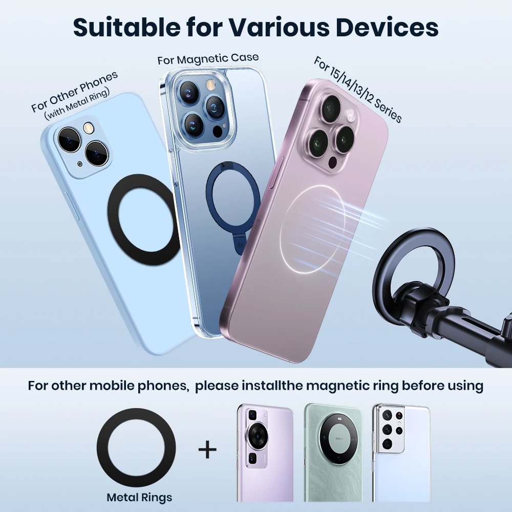 Designed for iPhone 15/14/13/12 series phones: It is compatible with Mag-safe for iPhone 15 series/14 series/13 series/iPhone 12 series phones, without the need for an additional metal ring. If your iPhone 15/14/13/12 series phone has a regular non-Mag-Safe case, you must use the provided adhesive hollow metal ring.